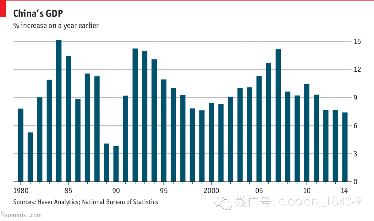 有关中国政府今天公布的2014年GDP数据的分析大都围绕着经济放缓做文章。从一个层面来讲,这是可以理解的。7.4%的增长是中国在24年中最弱的(如图),也是本世纪第一次没有完成官方增长目标,虽说这个增速只比7.5%的官方目标差那么一点点。但是,从另一个层面来讲,聚焦于放缓是近乎短视的做法。中国已于去年跻身一家高等俱乐部:经济产出超过了10万亿美元,使得他们成为完成这一壮举的仅有的第二个国家(美国已在2000年达到这一水平)。按照市场汇率,中国去年的经济产出是10.3万亿美元,比仅仅10年前的1.9万亿美元大出了5倍。